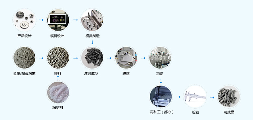 金屬粉末注射成型-將金屬粉末通過與粘合劑混合后利用注塑機通過成型成我們需要的產品。再經過脫脂燒結緩解制成金屬配件,大大地降低了生產成本,提高了生產效率和產品進度。
